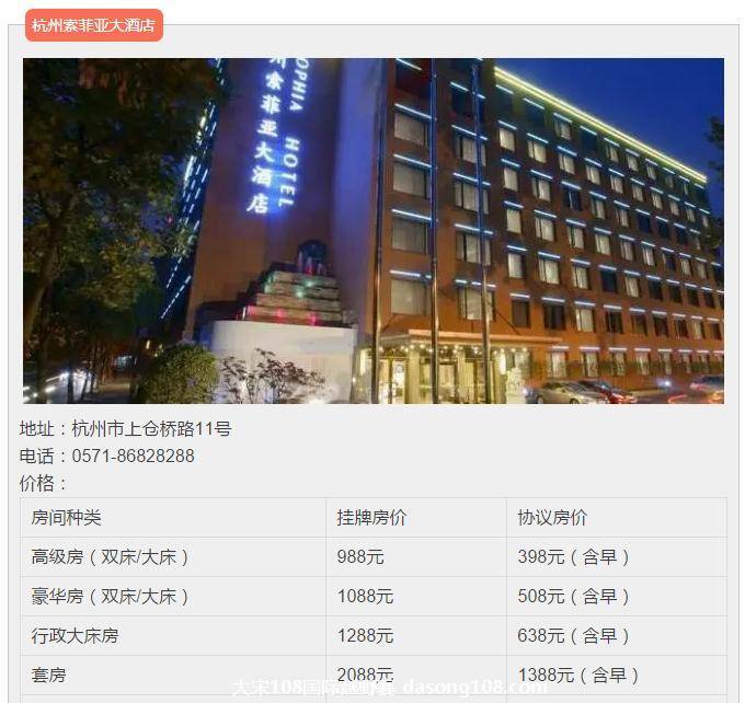 选手提前预定或现场订房时,说明大宋108参赛选手,即可享受协议价。具体服务详情以酒店公布为准。因有时节差异,建议提前电话咨询、预定。