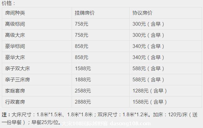 注:标间床位1.2米*2米;普通大床:1.5米*2米;高级大床:1.8米*2米